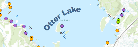 In 2016 Rideau Valley Conservation Authority surveyed the lake and provided this map that denotes the presence of three invasive species they had set out to identify.